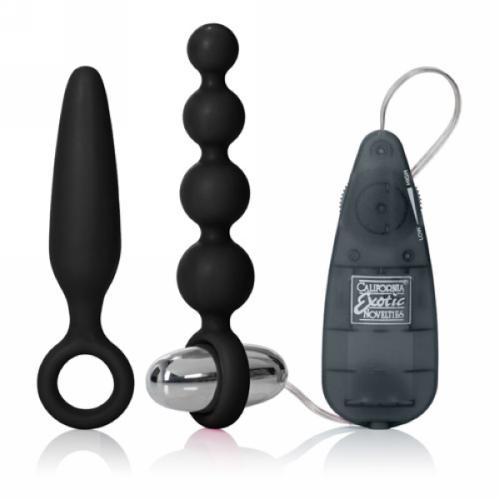 - The 3-in-1 anal toy kit includes a vibrating butt plug, a wand of graduating anal beads and a remote control.