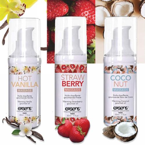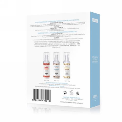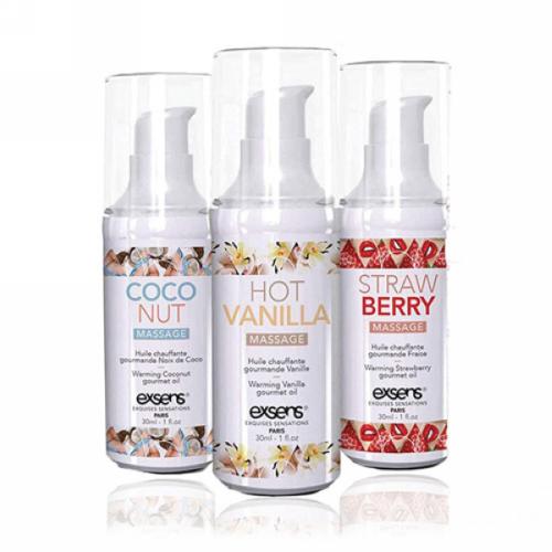 The set includes:1 fl.oz. bottle each of: Strawberry, Coconut, Hot Vanilla Warming Massage Oils